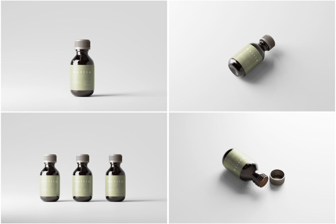 A common type of bottle used for medicine and chemicals packaging mockup template. change cap color, change bottle color and background color. background can also be textured if needed. four mockups in total for free of charge. feels free to use this for even commercial projects as well as personal use.