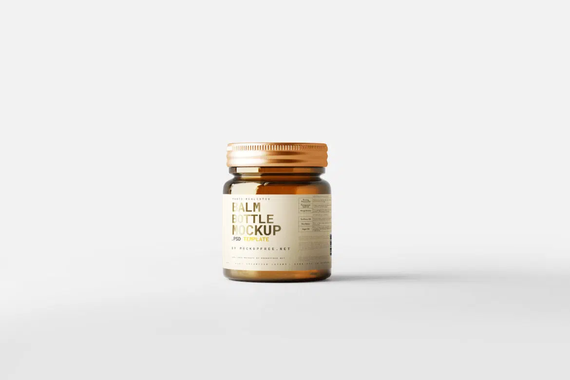 A small ointment balm bottle mockup set. bottle size is 50ml to 200ml or anything between. five ointment bottle scenes in different angles. bottle is rendered with amber color but shade of glass can be changed with color adjustment options. label can be transparent or non-transparent as well.