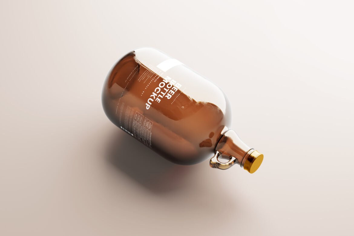 This is a set of beer bottle mockups made out of amber glass. the bottle has a handle and this type of bottles are used for packaging beers larger than 750ml. bottle has a small handle and the glass color is darker amber color. bottle cap is a screw cap made out of metal. displayed in the previews as golden color but any color is applicable. colors are all editable including the cap and the bottle body.