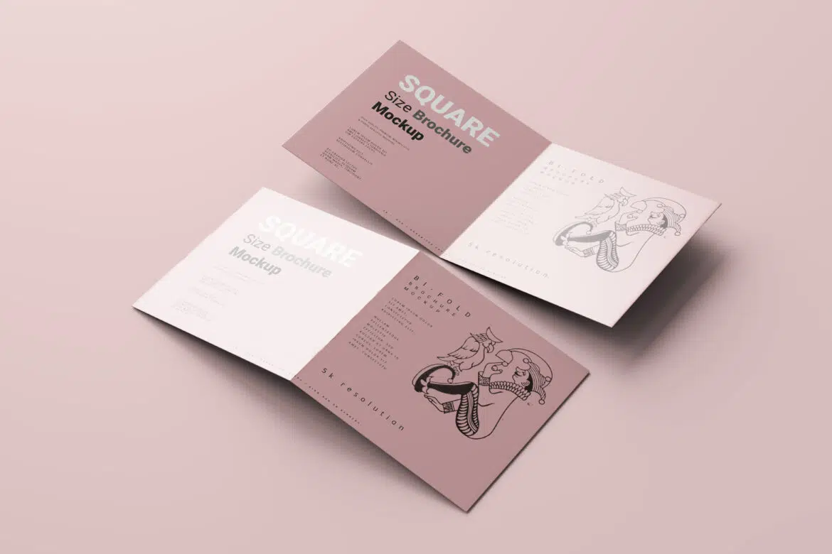 Five square size bi-fold or two fold brochure mockup templates. you can showcase your brochure designs to clients with photo-realistic output.