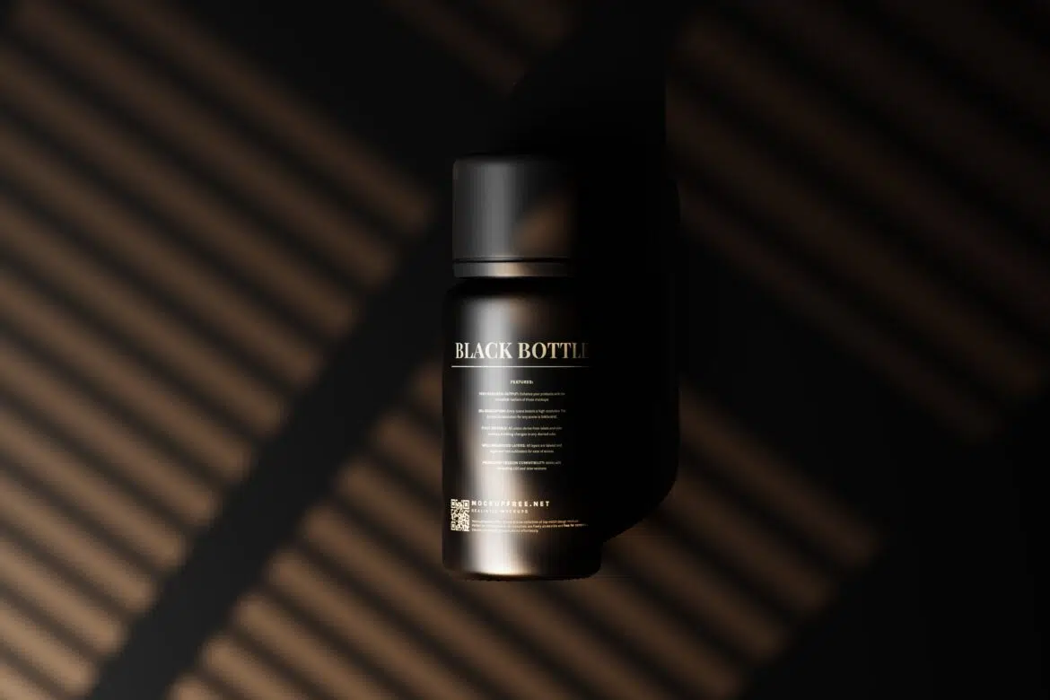 Cosmetic Black Bottle Mockups – Small black bottle packaging mockups with dark color setup / theme