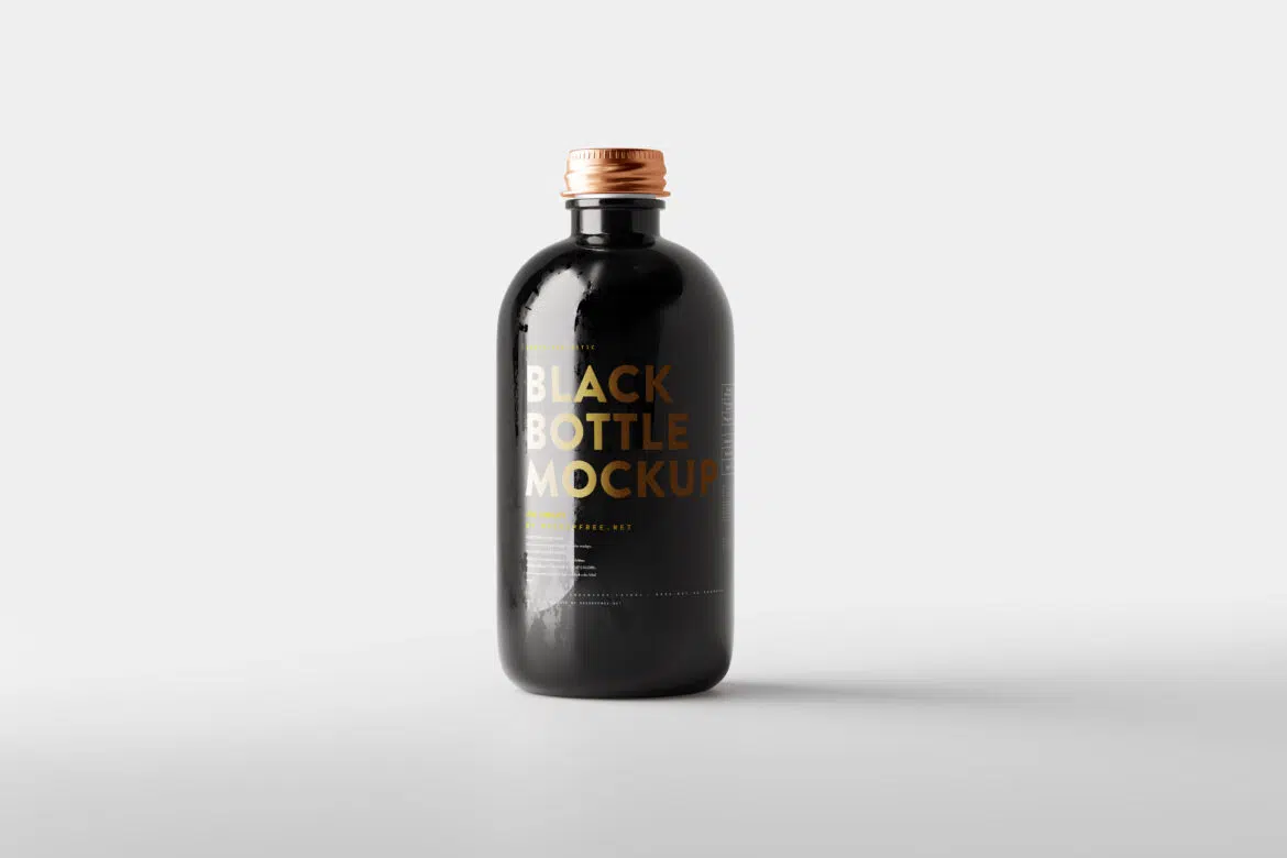This is a set of black glass bottle mockups. used for packaging medicine, alcohol, chemicals, cosmetics and oils. screw cap is a metal aluminum cap and the bottle body is black glass with non see through materials. close to amber glass but more darker.