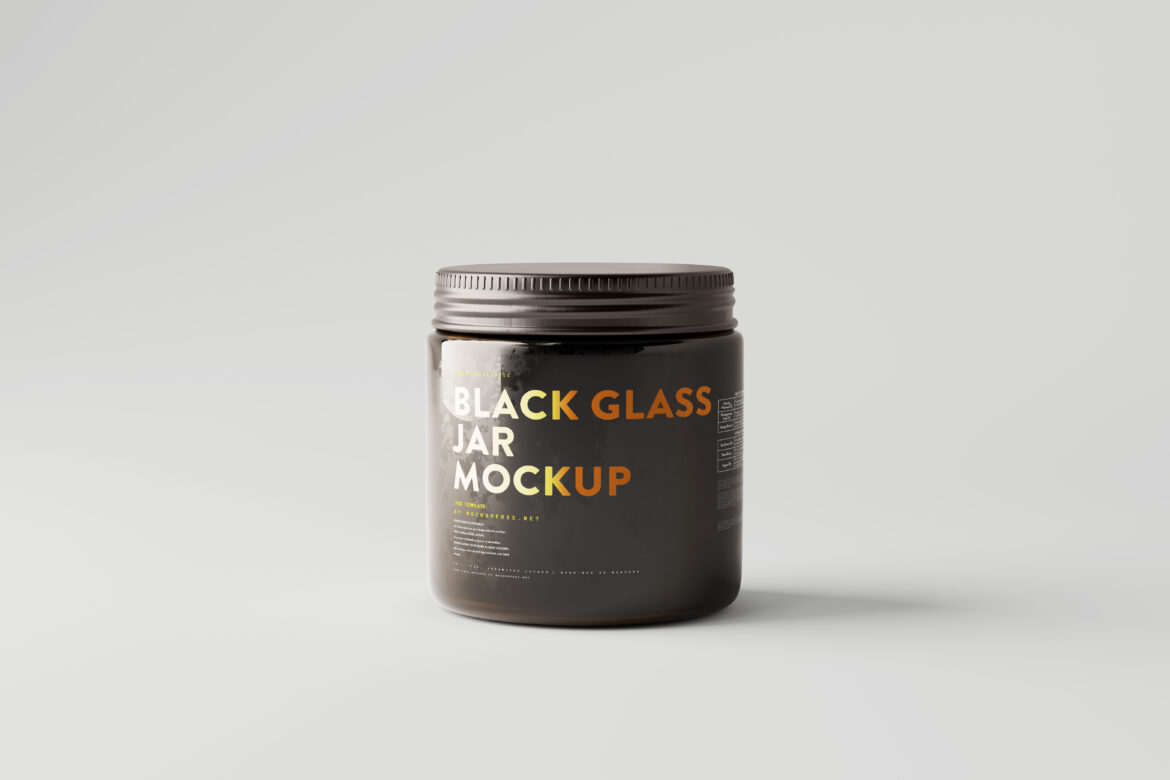 This is a set of dark color black glass jar mockups featuring a dark color glass standard size jar. jar size is about 750ml or similar and this type of jars are used for food packaging and some cosmetic product packaging. label is previewed as a transparent label but you can use none transparent labels as well.