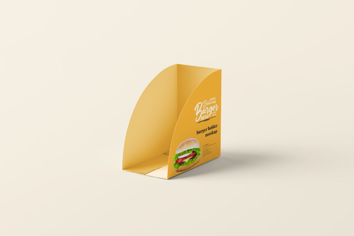This set of burger holder mockups helps you to showcase burger packaging designs in a realistic way. This mockup set includes five PSD scenes, each featuring a different angle and arrangement of the burger holder.