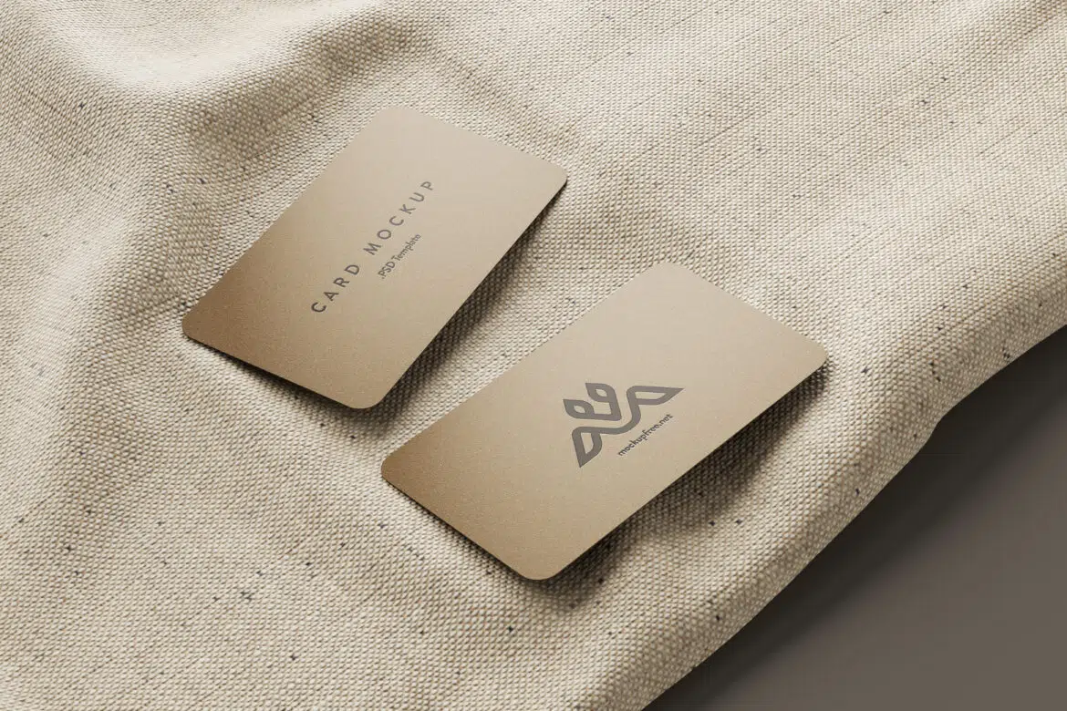 this mockup set is for a rounded corner aka die cut business card mockups. cards are placed on a burlap fabric bag and has a yellowish burlap texture. this burlap texture is hard rendered and can not be removed. five mockups and all of them have the burlap background.