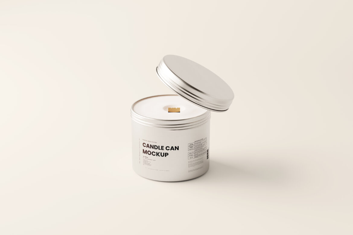 This is a set of aluminum candle can mockups featuring an aluminum metallic candle jar / can. only one scene includes a closed lid candle can and other four is with an opened lid. wick is wooden textured and the wax is matte slightly yellow color wax. all are editable and the body can be mocked up with transparent or non-transparent labels.