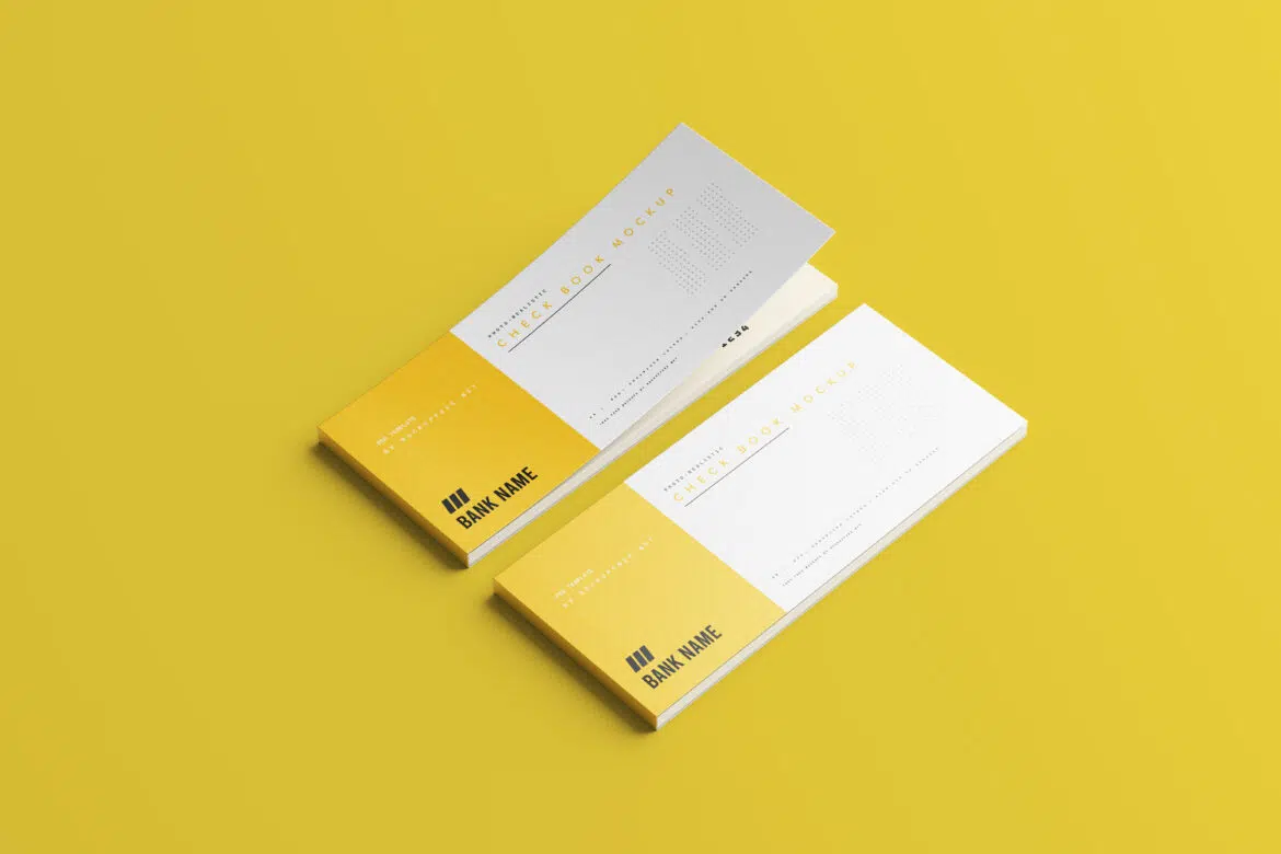 A Check Book mockup set for your stationery branding shots. can be used for other purposes as well. i.e ticket book. this features a closed check book and a slightly open check book. some scenes featuring both and some just one of them. includes a total of six mockups with isolated white background.