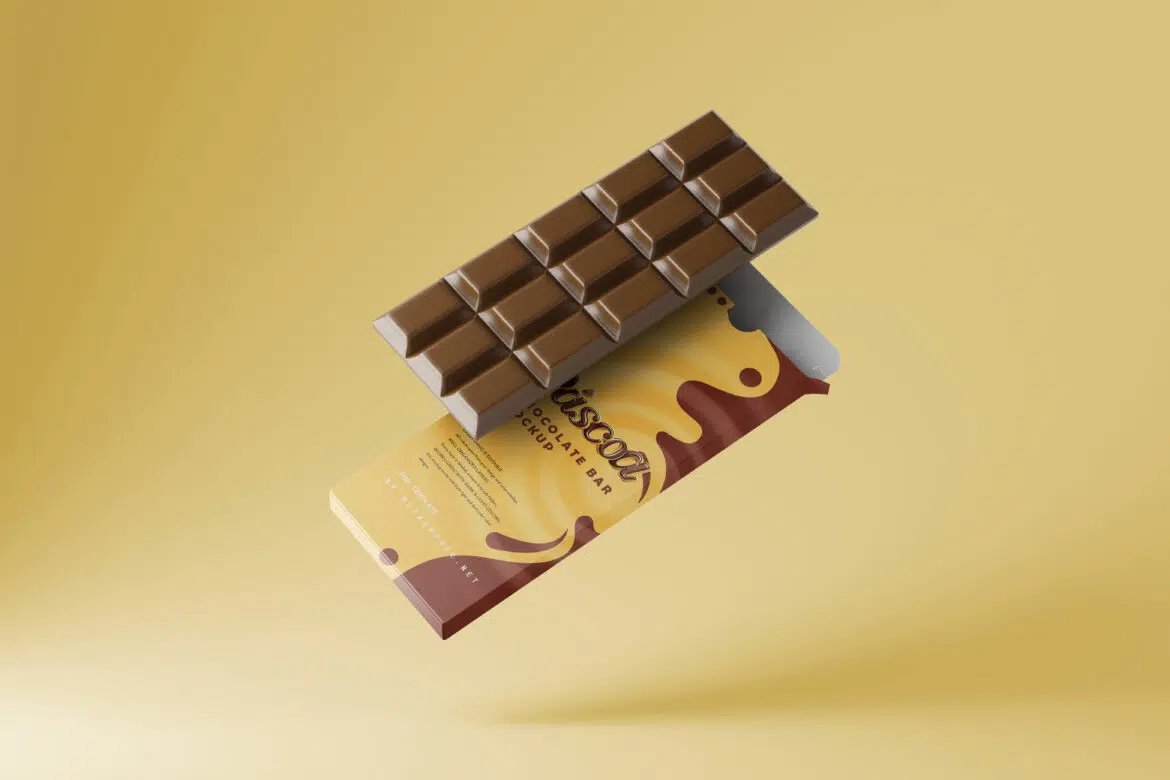Chocolate Bar packaging mockup set. includes five mockup scenes of a regular size Chocolate Bar. Some scenes showcases the Chocolate Bar with the outer packaging and some only showcases the outer packaging only. you can apply your Chocolate label design and use the generated images for adverts, on social media etc.