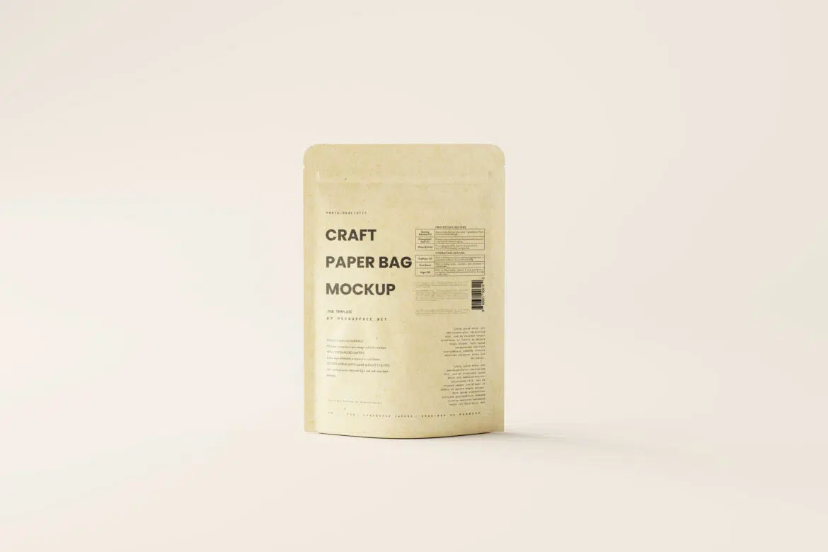 This is a set of craft paper bag mockups featuring a craft paper material bag typically used for product packaging like nuts, serial, powder etc. craft paper texture is not editable but the color is. you can change the design and the color of the bag using the smart object layer.