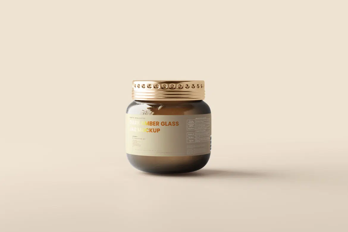 This is a set of food jar mockups featuring a dark glass / dark amber color glass round shaped food jar. jar is very round shaped and the lid is made out of metal and metal color can be adjusted. color tone of the glass body can be changed.