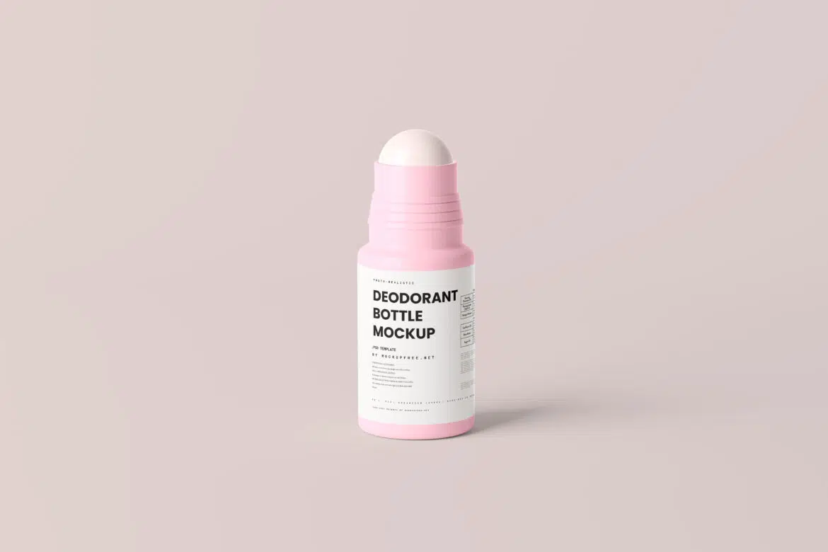 This is a set of deodorant mockups featuring a deodorant bottle with a rotating ball at the top. bottle body is plastic and has no cap in the scene. just the bottle and background. you can modify the label with your own label to showcase your cosmetic deodorant products.