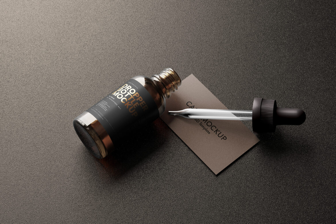 These five dropper bottle and business card mockup scenes feature an amber color glass dropper bottle with black plastic closure and a 3.5×2 size business card. a dropper bottle mockup set with premium quality offered with a free license.