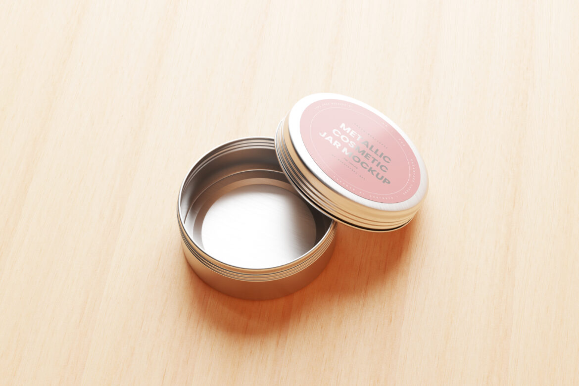 An aluminum flat jar label mockup set for mocking up your cosmetic or similar products. can be used for balm, ointments, cream, oil, powder or candle packaging. the jar body and lid is on separate layers. the jar itself is a very flat and thin jar made out of aluminum. jar only has a label on top of the lid and the rest has no labels or designs. but you can change the color of the body and the lid.