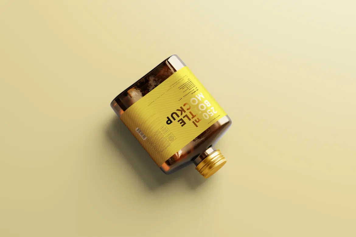 This is a small 250ml flat square bottle mockup set. this type of bottles are used for mainly hard liquor packaging. also used for medicine packaging and oil packaging as well. bottle is rendered dark amber color and screw cap is an aluminum type cap with slightly glossy finish.