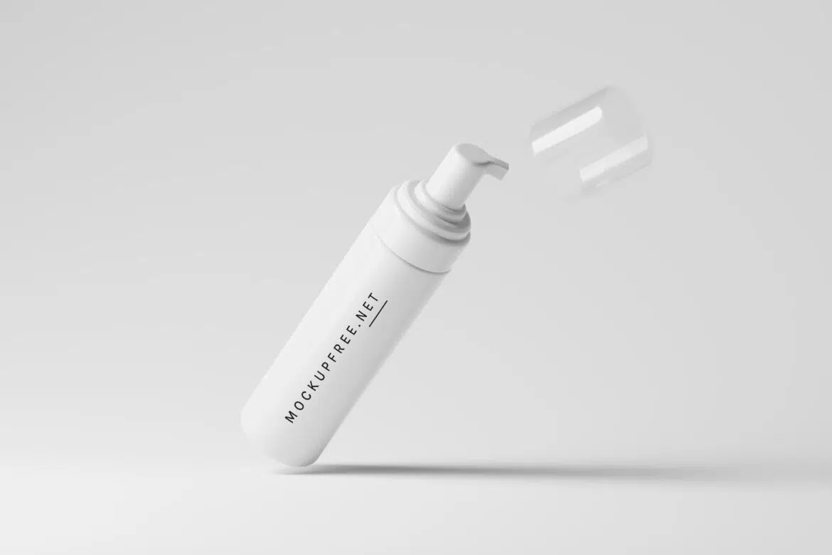 This is a foam pump bottle mockup set featuring a standard foam pump bottle made out of plastic. bottle body is plastic and non-transparent and the closure is a pump. there is a cap on top of the closure which is clear plastic transparent cap.