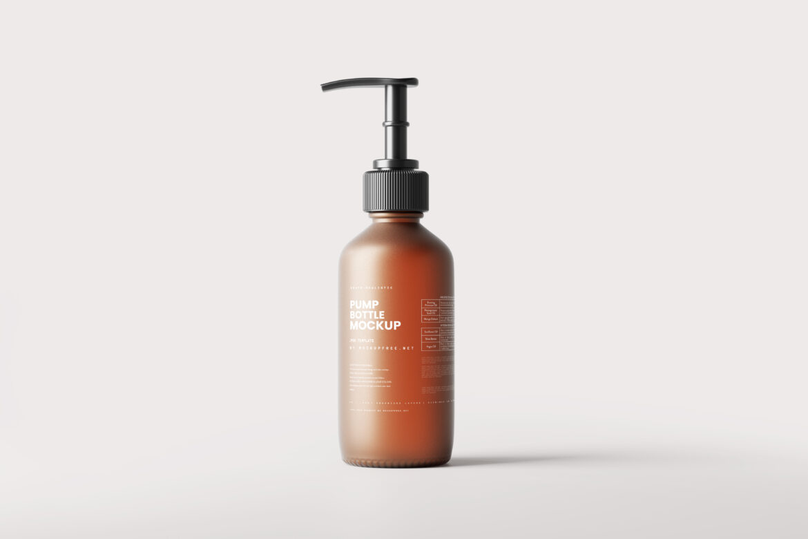 A pump dispenser bottle mockup set made out of frosted amber glass. for products such as cosmetic creams, lotion, liquids, serums and such. has a unique type of closure but you can use your own by placing on top of it. the closure is on a separate layer and can be disabled or hidden. label can be transparent or non-transparent like shown in the previews.
