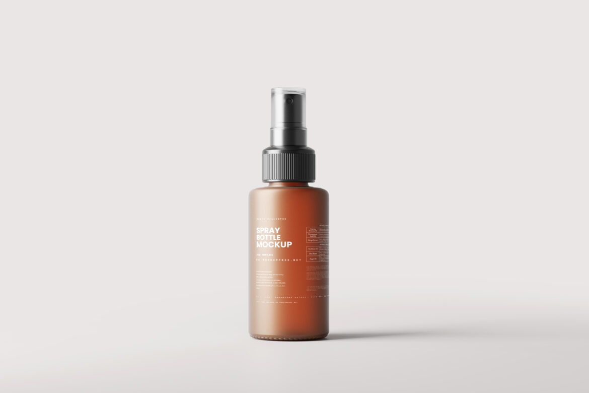 A spray bottle mockup set with frosted amber glass material. cap or closure is plastic and originally rendered in black plastic but colors can be applied. bottle color is changeable through hue/saturation adjustment to any color of your liking. label can be transparent or non-transparent (see the previews)