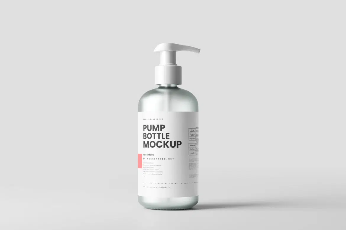 Frosted glass pump bottle mockups for cosmetic product packaging showcase. you can apply fully transparent or semi-transparent label designs and the transparent parts of the label will reveal the bottle underneath. bottle has no color but can be added. bottle has high details such as glass grainy frosted texture etc.