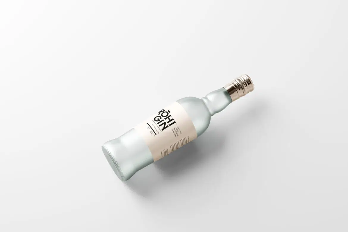 Five Liquor bottle mockups with a frosted glass bottle. This is for showcasing your spirit or hard liquor bottle. Bottle is a round commonly used shape of bottle in spirits. bottle has a frosted glass texture with semi transparent white / clear glass material. cap is a screw cap made out of metal.