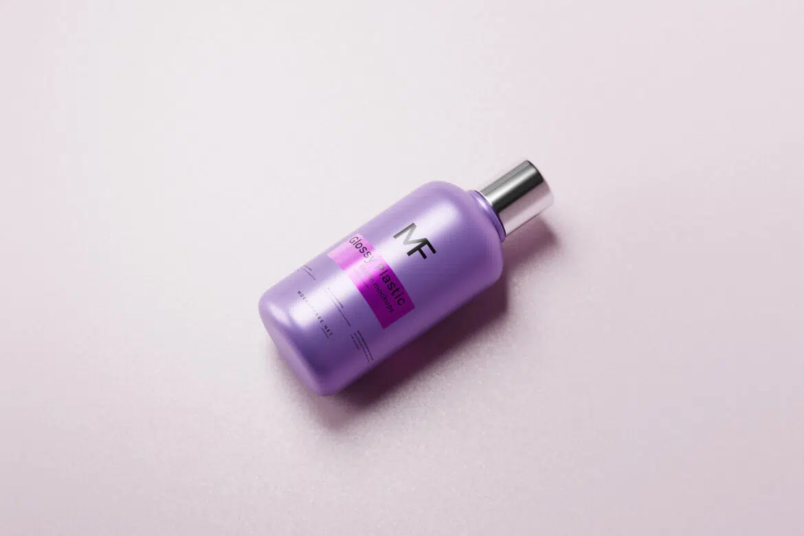 Introducing a collection of mockups featuring glossy plastic cosmetic bottles with silver caps.