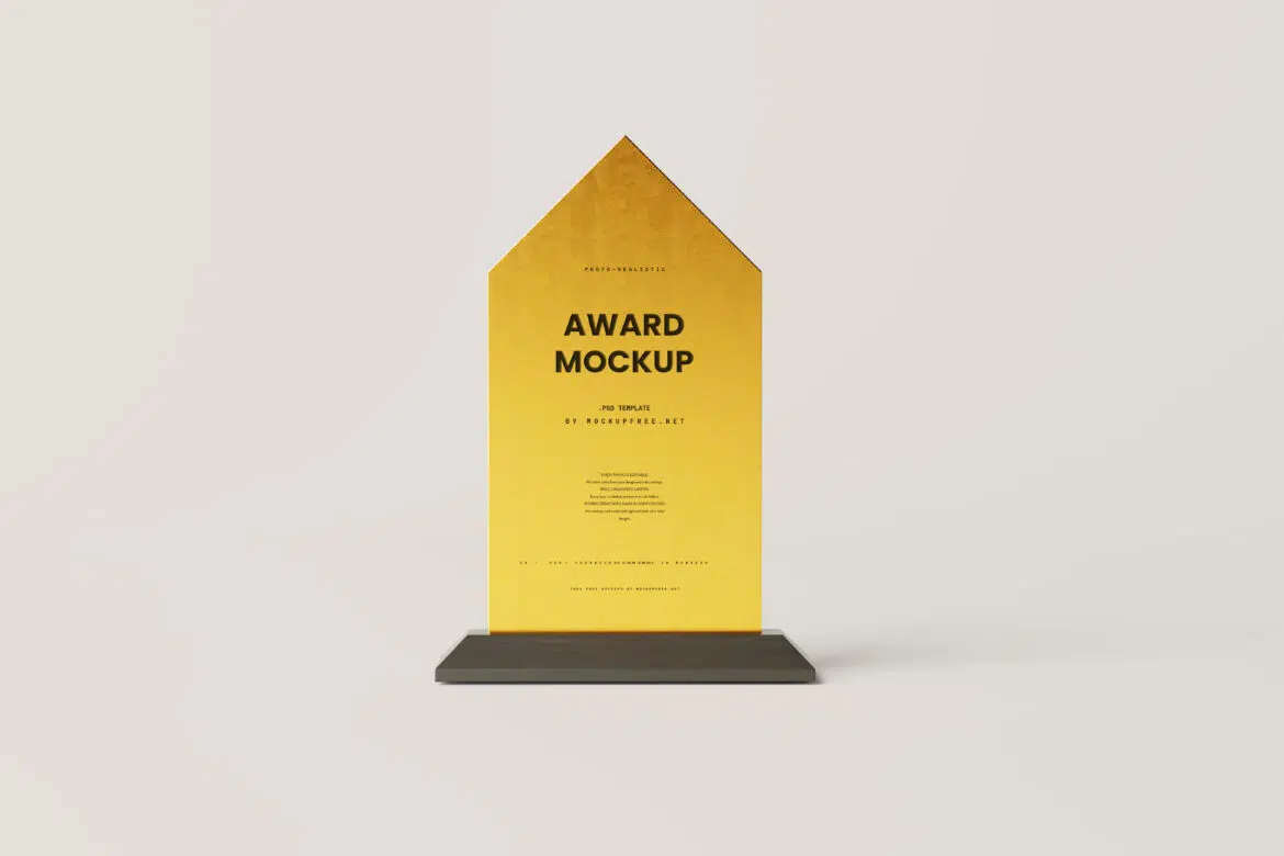 This is a set of award mockup scenes which you can use to mockup text of images on to a gold color award with a triangular top. the base is wooden and everything can be edited such as color, design etc.