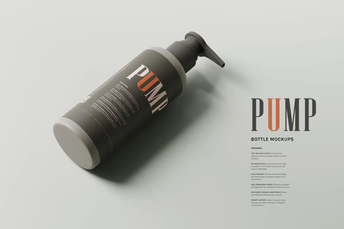 This is a set of Greige colored plastic pump bottle mockups. Includes 8x realistic pump bottle mockup scenes in Photoshop PSD file format.
