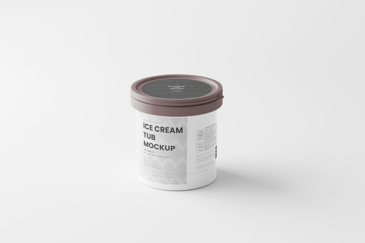 This is a set of plastic ice cream container tub mockups. featuring a small size ice cream container. size is close to 1L and there are two labels on the container, one on the lid and one around the tub body. lid color and the body color is changeable.