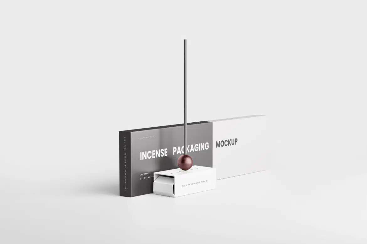 Incense packaging mockups featuring an incense box and a stick with stick holder. minimalistic mockup templates to showcase your incense packaging designs or to represent your brand. box is a standard incense stick box and this size usually contains 50 – 100 sticks.