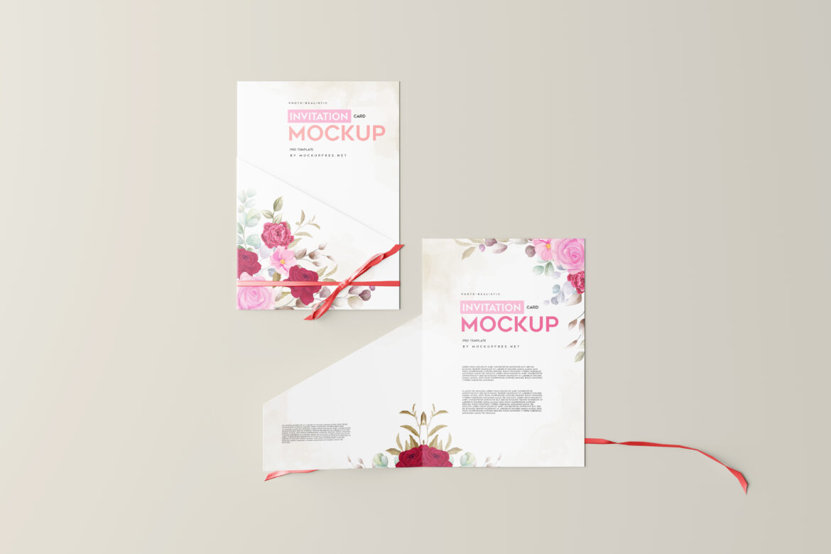 This is a set of wedding invitation card mockups featuring a bi-fold half cut invitation card and a ribbon. card design can be changed with the smart object and the ribbon color can be changed with the give options.