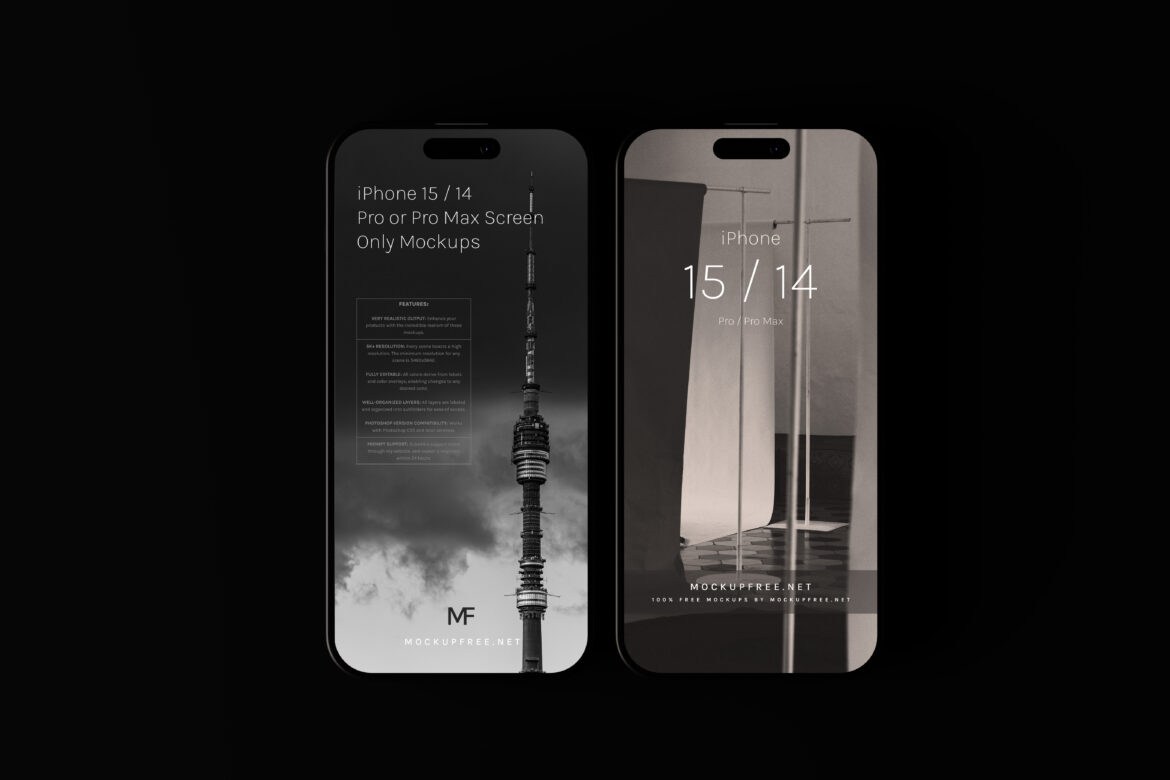 Check out these cool iPhone 15/14 screen mockups! They’re perfect for showing off your app, website, or any design. You’ll get 8 mockups in this pack. The best part? They all have a dark background that makes just the screen pop. This means whatever you put on the screen will be the star!