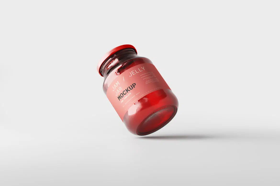 This is a red color glass jar mockup set. these type of jars usually used for jam and jelly packaging. rendered with red color glass but the glass color can be changed to match your exact product.