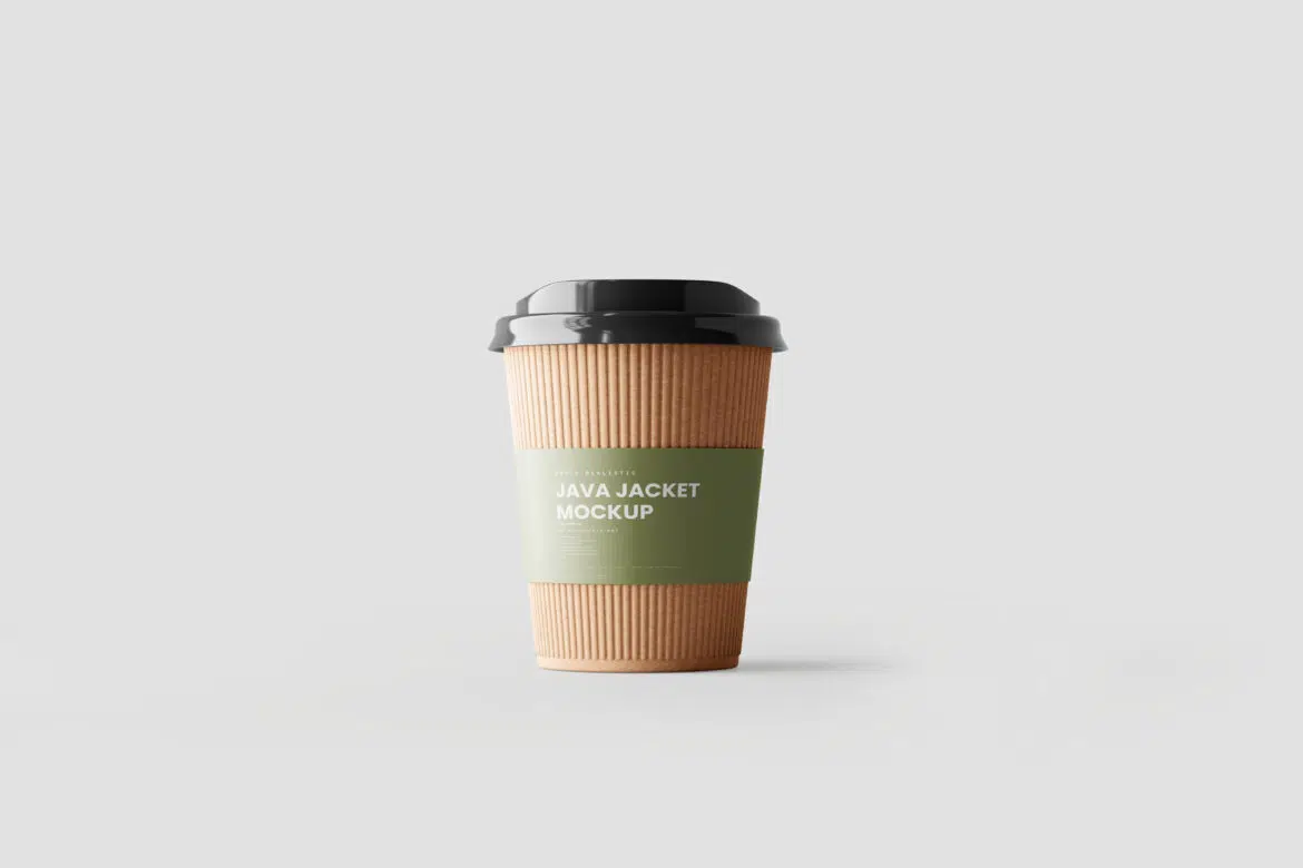 In this set of five mockup scenes you can see a paper cup and a insulating java jacket. you can apply your design or logo on to it and change the colors of the cup and the lid.