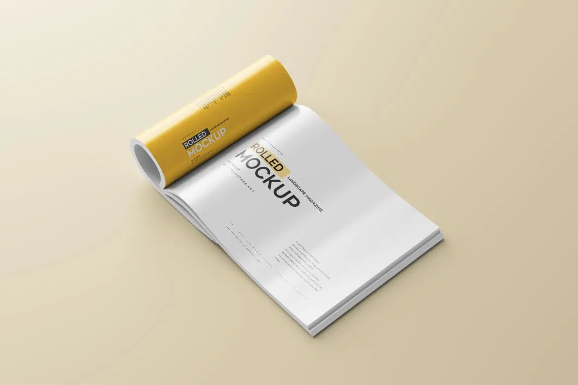 This is a set of rolled up landscape magazine mockups. includes five mockup scenes and all of them featured a one side rolled up magazine. magazine is a landscape / horizontal A4 magazine with slightly glossy paper.