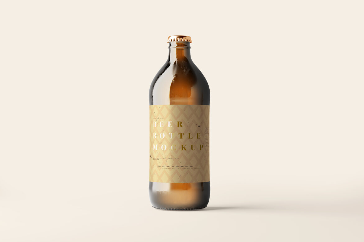 A large amber glass beer bottle mockup set featuring a larger size (over 500ml) beer bottle. can also be used for other beverages as well such as soda, carbonated drinks etc. bottle color is editable along with the cap color and the background color.