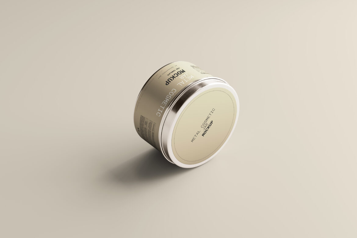 A metallic cosmetic jar mockups. five mockups featuring a flat metal jar with press on lid. metallic texture can not be removed and it is hard rendered in to the jar body. but you can change metal color and background.