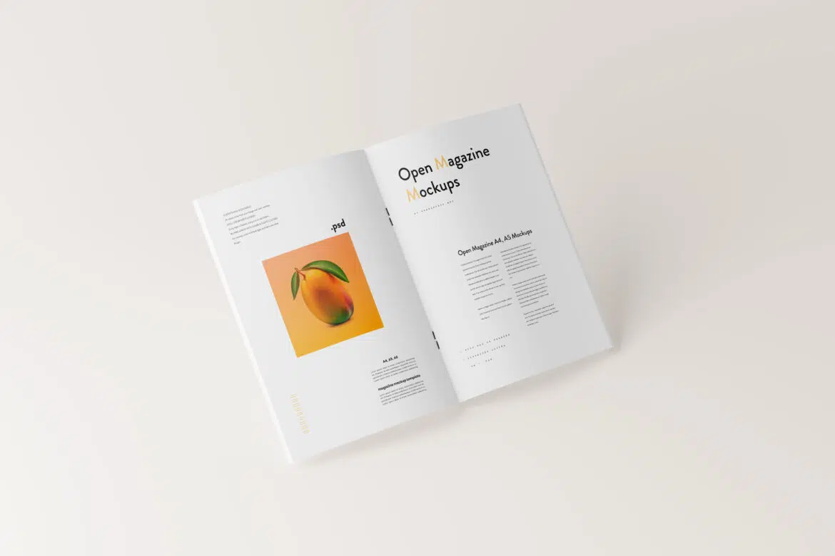 A mockup set of an open magazine featuring a rattan tray. five open magazine mockups for you to use for your magazine or brochure designs. you can present your designs with photo-realistic results to make your designs pop. can also be used as a tute mockup, book mockup or for any type of layout design. design of the left and right pages can be edited individually via smart objects. background color and other color options are changeable with the given options in the layer pallet.