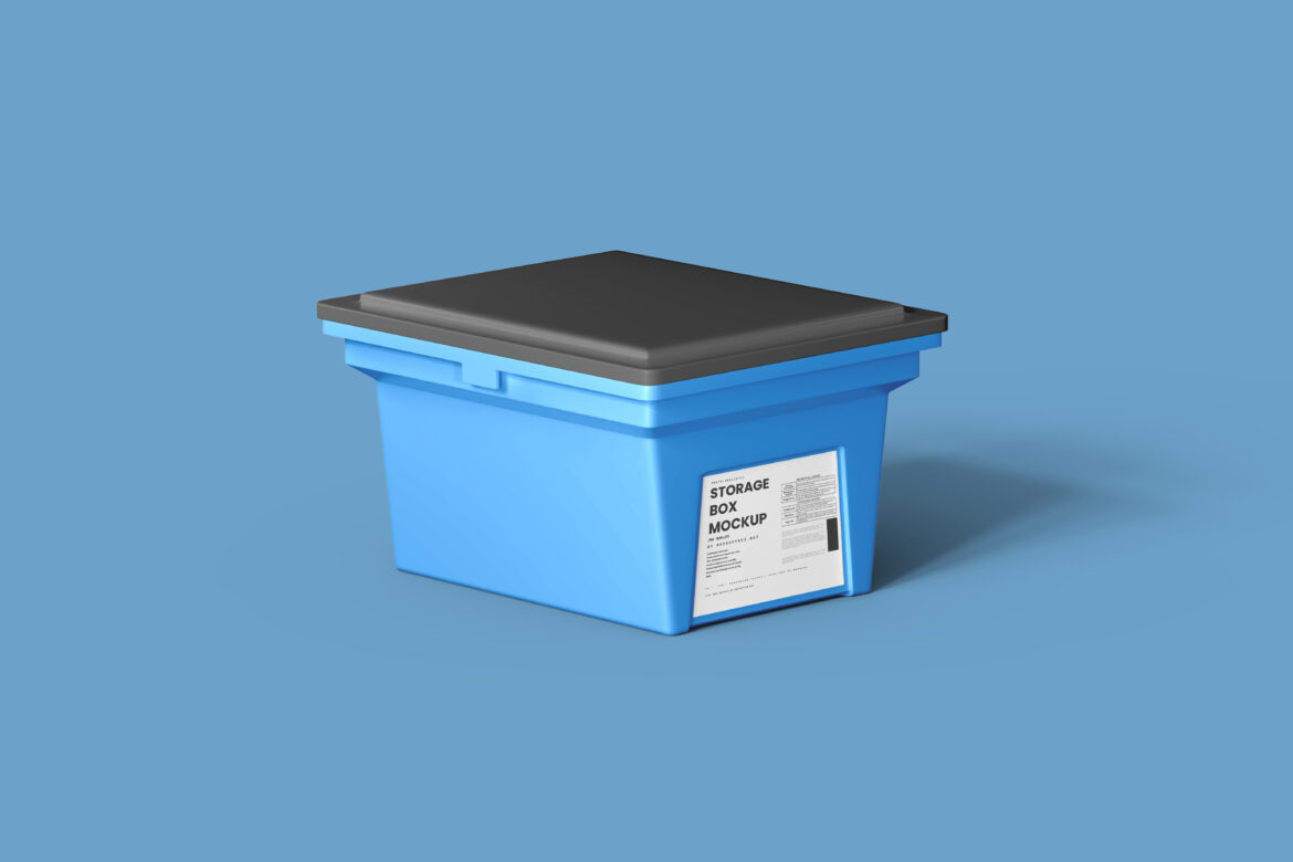 This is a set of storage box mockups featuring a plastic container with a lid on and a label on the side. body color and lid color is editable also the background colors. this type of boxes are typically used for storing items or products for transportation or safe keeping.