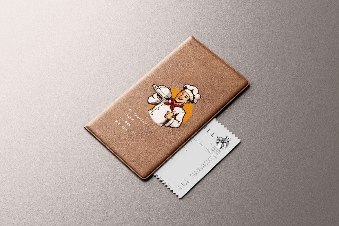 This is a mockup set featuring a leather cover folder, a bill / check and a credit card. best for restaurant branding shots to showcase your restaurant logo. folder is a leather cover folder similar to the size of a DL folder. includes a total of five mockups