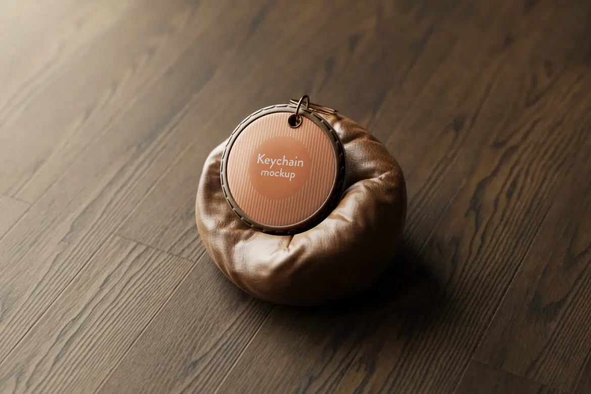 This is a Round Keychain on a lether pillow mockup. background is wooden and has a fixed texture. you can change color but can not change the texture. the keychain itself has a leather textured outer rim and metallic chains. a round keychain commonly used as advertising materials. can be used to showcase your custom keychain designs or promote your brand logo etc.