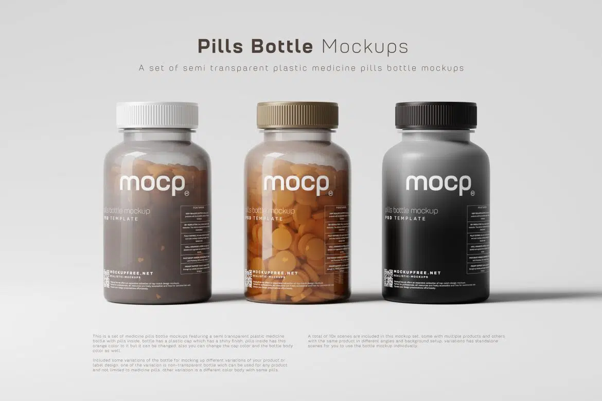 This is a set of medicine pills bottle mockups featuring a semi transparent plastic medicine bottle with pills inside. bottle has a plastic cap which has a shiny finish. pills inside has this orange color to it but it can be changed. also you can change the cap color and the bottle body color as well.