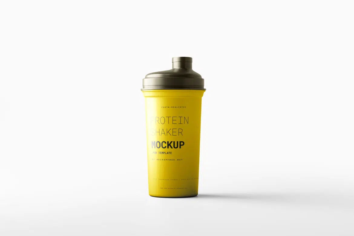 A set of protein shaker bottle mockups. with white plastic body and black plastic top lid. label is covering the whole body aria and the colors of the shaker bottle comes from the design itself. top lid can be color changed to a same shade of dark color.