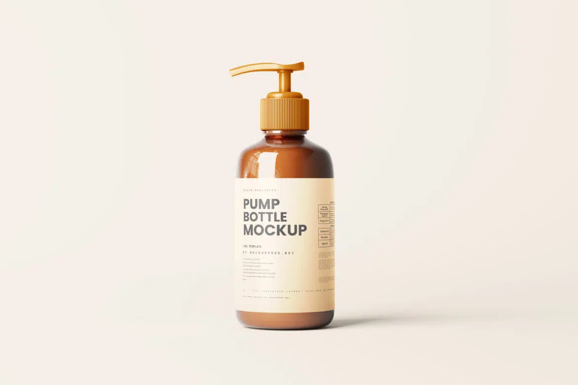 Amber glass pump dispenser bottle mockups for your cosmetic product packaging.