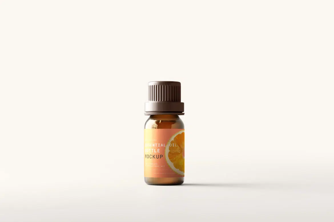 A small amber glass essential oil bottle mockups. you can put your own label in to this and generate photo-realistic photographs for adverts and other type of promotions.