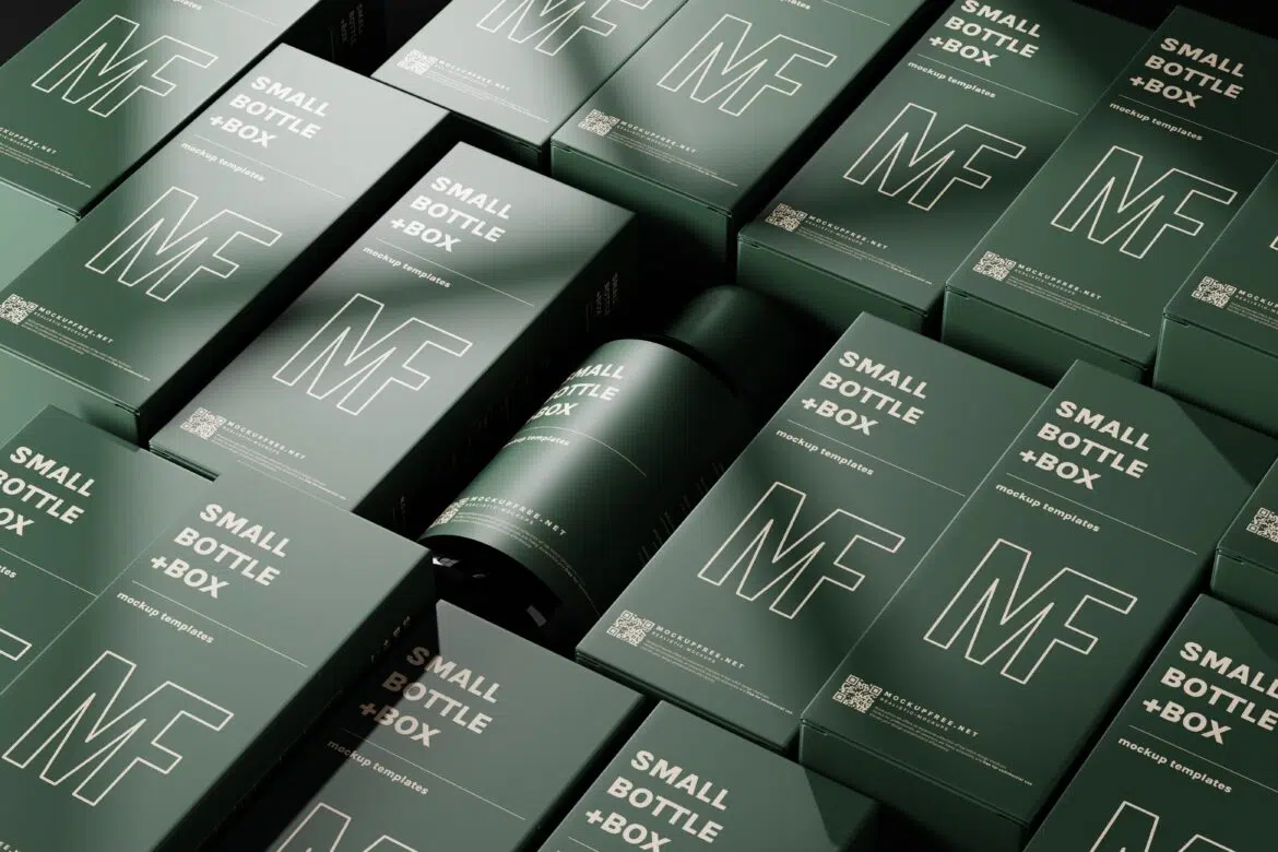 This is a set of bottle and box mockups featuring a black glass bottle and a paper box packaging. bottle has a screw cap and a shiny black glass body. outer box is a regular paper box with a matte finish. this type of liquid bottle packaging mockups can be used for showcasing medicine or cosmetic products such as oils, creams, serums, syrups, lotions etc. can also be used for various chemical packaging as well such as pesticide, cleaning liquid, polishing compound etc.