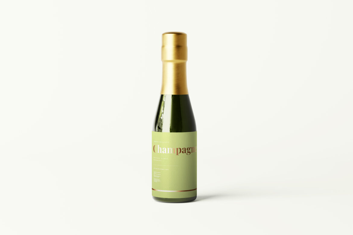Small mini wine or champagne bottle mockups are design templates that showcase tiny wine or champagne bottles in a visually appealing and photo-realistic way.