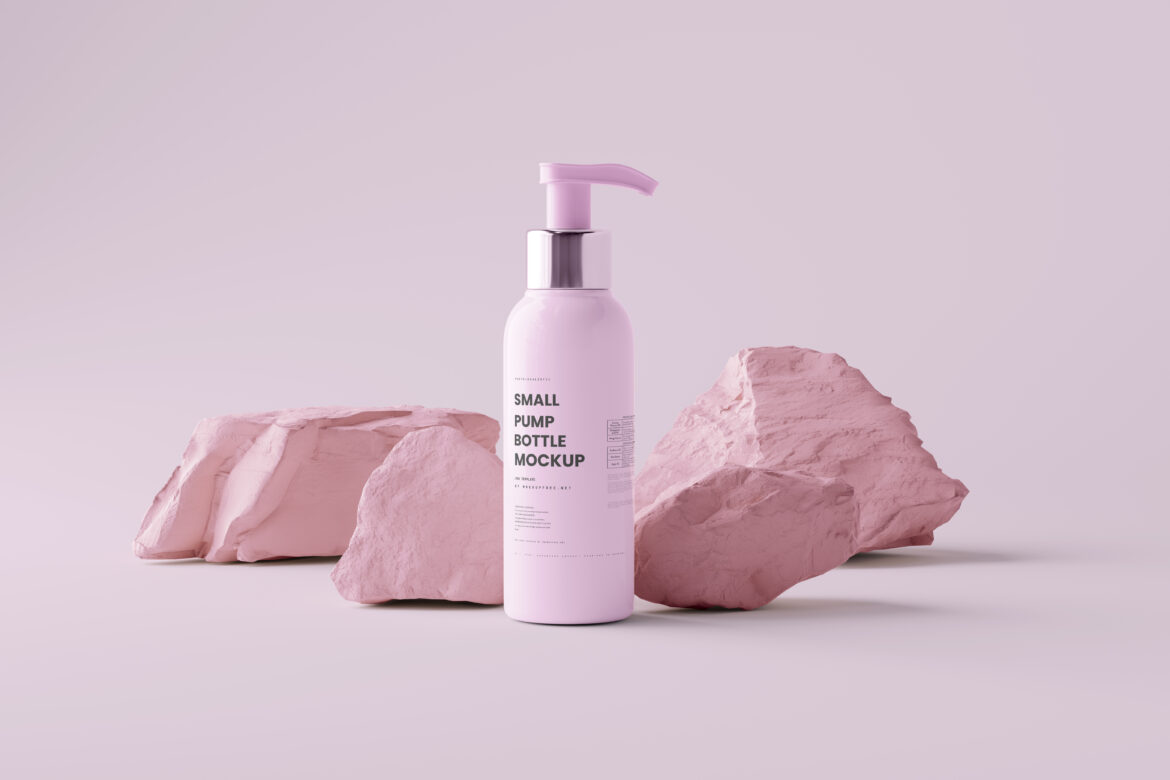 This is a set of small pump bottle mockups featuring a small pump bottle size of 100ml. pump bottle body is white plastic and can be applied any color. pump closure has two parts, shiny metallic round part and a white plastic top nozzle. all are color changeable.