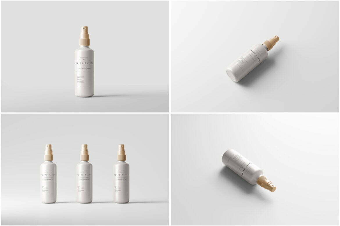 4x Mockups of a plastic spray bottle. 4x individual scenes to mockup your product or label.
