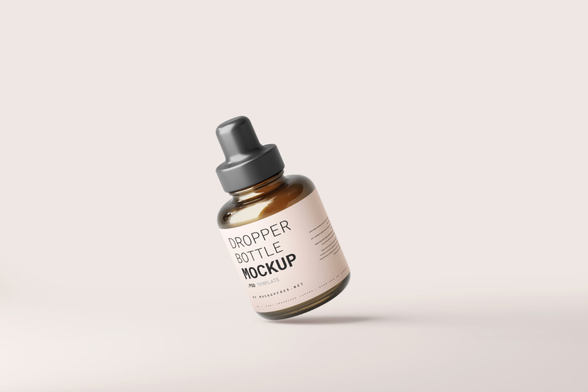 Five amber glass stubby dropper bottle mockups. rendered with yellowish or amber color glass but the glass color can be changed to any color you want. but the it will be the same shade of the amber color. to make it bright, use the Brightness & Contrast adjustment within the photoshop.