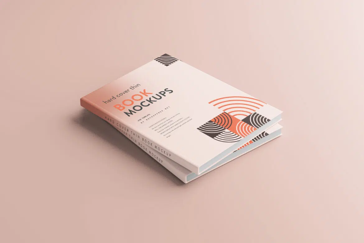 This is a set of thin hard cover book mockups. book is a thin hard cover book similar to size of 50 – 150 pages book. size is standard A5 or similar. can be A5, A4, B5, B4 etc.
