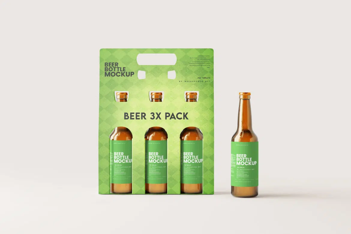 Download three pack beer bottle carrier PSD mockups for free